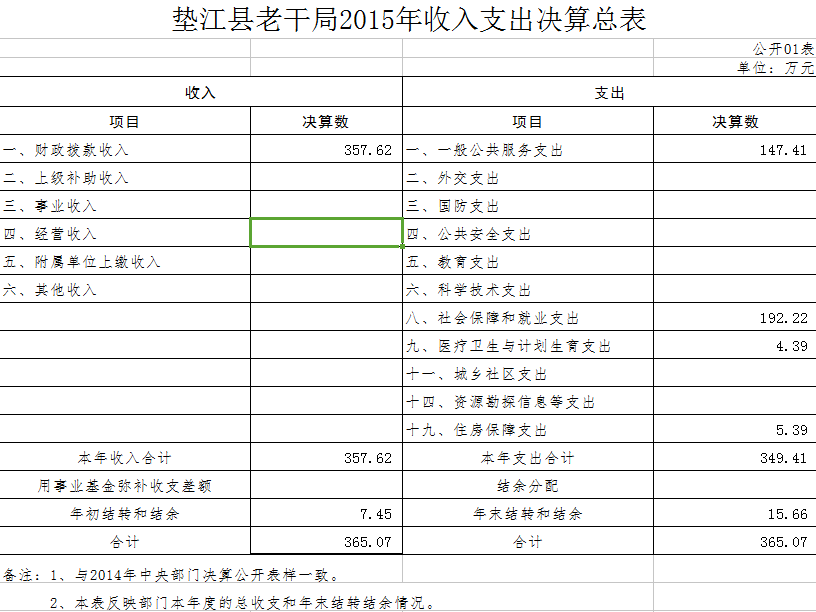 1.财政收入357.62万元,上年结余7.45万元,收入合计为365.07万元,比2014年增加38.71万元。