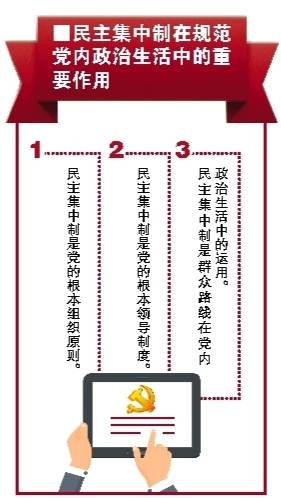 新华社北京12月12日电 《关于新形势下党内政治生活的若干准则》指出:“民主集中制是党的根本组织原则,是党内政治生活正常开展的重要制度保障。”对于民主集中制在规范党内政治生活中的重要作用,可以从以下几方面来理解。